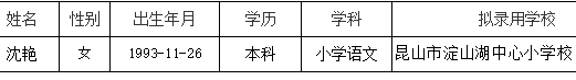 根據(jù)《2020年昆山市教育系統(tǒng)公開招聘中小學(xué)教師簡章》,沈艷(人員信息附后)已通過昆山市教育局組織的筆試、面試、體檢(因懷孕緩檢)和考察,現(xiàn)進行錄用公示,公示時間為2021年2月24日~2021年3月4日。如對公示對象有異議,可在公示期間向昆山市教育局反映,聯(lián)系電話:57553129。