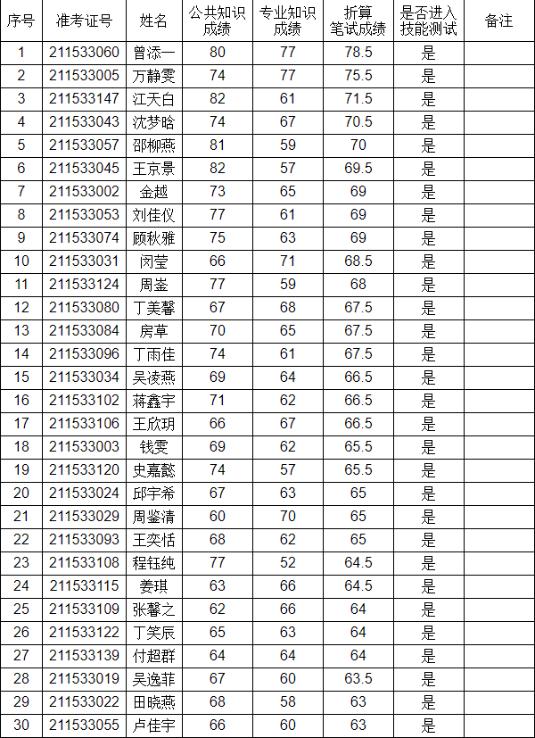 一、報(bào)考幼兒教師Y01崗位進(jìn)入技能測試名單及筆試成績(總計(jì)51人)