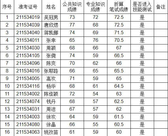 二、報(bào)考幼兒教師Y02崗位進(jìn)入技能測試名單及筆試成績(總計(jì)16人)