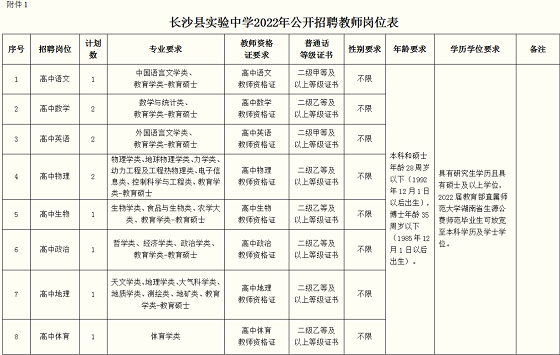 附件1:長沙縣實驗中學2022年公開招聘教師崗位表