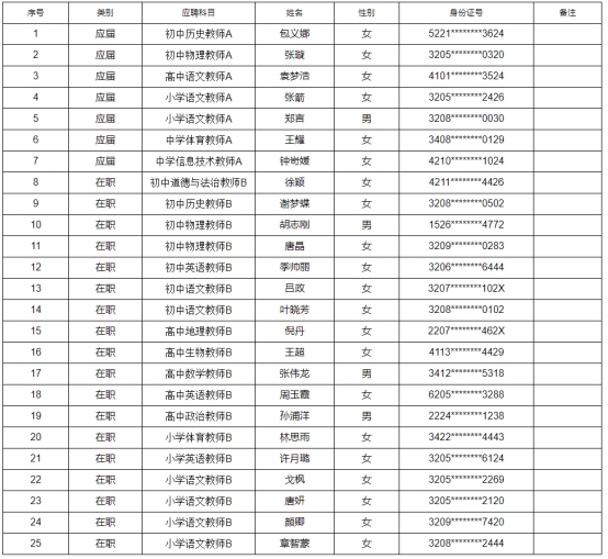根據《2024年蘇州高新區公開招聘教育專項編制教師公告》要求,經過報名、考試、體檢和政審,擬錄用包義娜等同志,現公示如下: