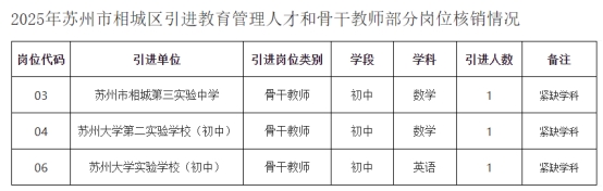 2025年蘇州市相城區引進教育管理人才和骨干教師報名工作已結束。根據公告規定,以下崗位(見附件)未達到開考比例予以核銷。