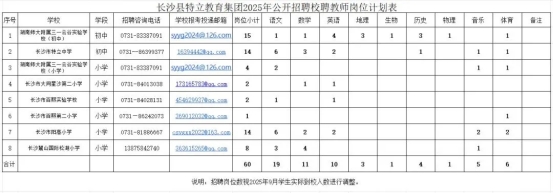 本次招聘崗位計劃詳見《長沙縣特立教育集團2025年公開招聘校聘教師崗位計劃表》(招聘崗位數可視2025年9月學生實際到校人數進行調整)。
