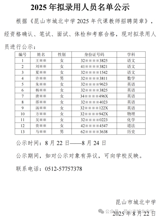 2025年蘇州昆山市城北中學(xué)擬錄用人員名單公示