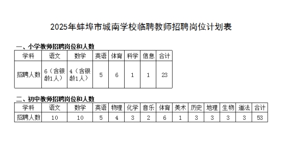 因學校發展需要,蚌埠市城南學校計劃公開招聘部分編外臨聘教師76人(其中小學23人,初中53人),請有意應聘者加入QQ群(招聘唯一官方群號:975502459),并在此群內填寫在線報名表進行線上報名,線上報名時間截止至2025年8月23日17:00。后續相關招聘工作信息一律在此群發布,請考生及時關注群通知。