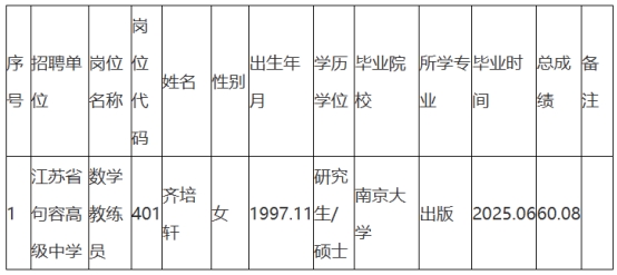 根據《句容市教育局所屬學校2025年公開招聘緊缺教育人才公告》(鎮句事招公告〔2025〕4號)經資格審查、面試、體檢和考察,現將句容市教育局所屬學校2025年公開招聘緊缺教育人才擬聘用人員名單予以公示,公示時間2025年8月25日-9月2日。