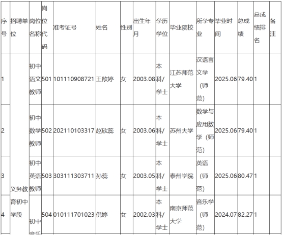 根據(jù)《2025年句容市教育系統(tǒng)部分事業(yè)單位公開(kāi)招聘事業(yè)編制教師公告》(鎮(zhèn)句事招公告〔2025〕1號(hào))經(jīng)資格審查、考試(筆試、面試)、體檢和考察,現(xiàn)將2025年句容市教育系統(tǒng)部分事業(yè)單位公開(kāi)招聘事業(yè)編制教師擬聘用人員名單予以公示,公示時(shí)間2025年8月25日-9月2日。