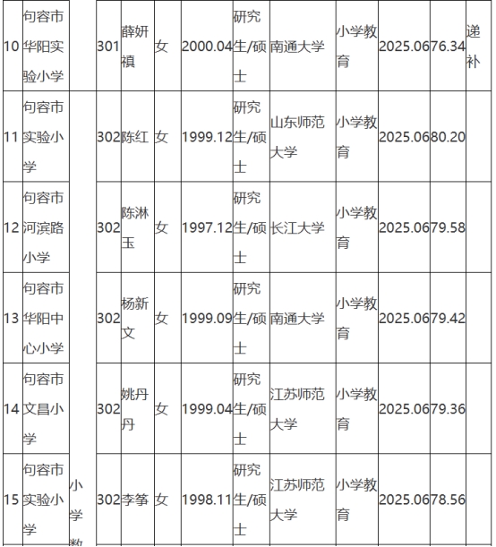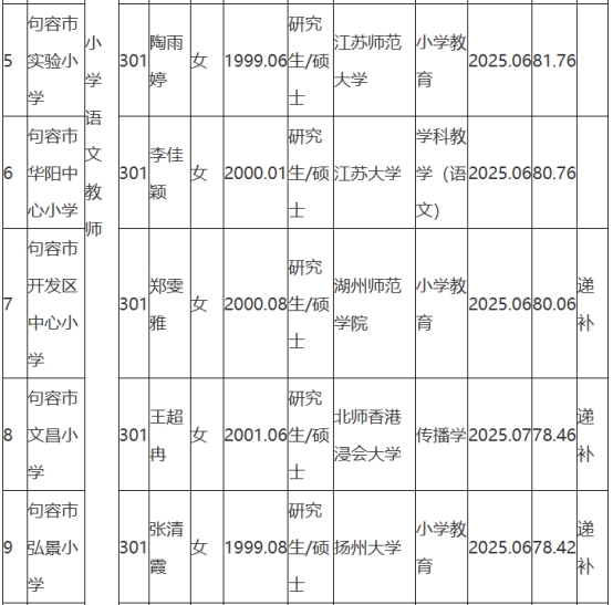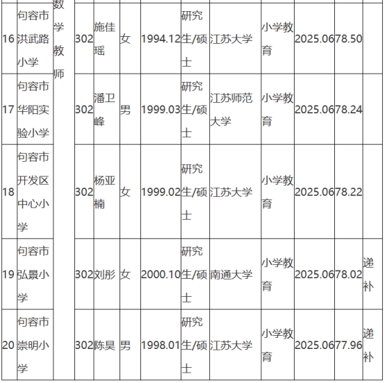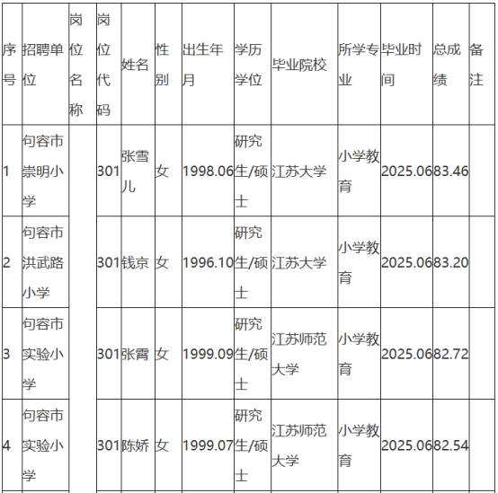 根據《句容市教育局所屬學校2025年校園公開招聘教師(江蘇師范大學考點)》(鎮句事招公告〔2024〕11號)經資格審查、面試、體檢和考察,現將句容市教育局所屬學校2025年校園公開招聘(江蘇師范大學考點)擬聘用人員名單予以公示,公示時間2025年8月25日-9月2日。