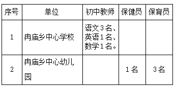 根據工作需要,潁東區冉廟鄉中心學校面向社會招聘初中派遣制教師5名、保育員3名和保健員1名,現公告如下: