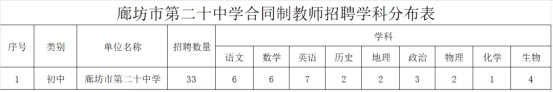 根據工作需要,現面向參加廊坊市安次區2025年(編制)教師招聘,報考廊坊市第二十中學相應學科崗位,已經面試考試且成績在本學科排名前80%,但沒有進入考核環節的非安次區現有合同制教師考生(放棄考核資格的考生禁止報考),開展廊坊市第二十中學合同制教師招聘工作。