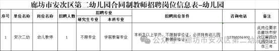 (五)具有崗位要求的相應學歷、學位、專業、教師資格證。詳見附件《廊坊市安次區第二幼兒園合同制教師招聘崗位信息表》