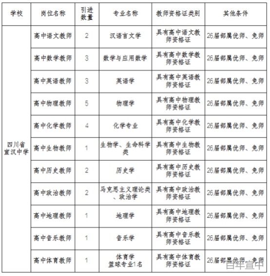 四川省宣漢中學本次提供25個帶編教師崗位,分別是高中語文、高中數學、高中英語、高中物理、高中化學、高中生物、高中歷史、高中思政、高中地理、高中音樂、高中體育。根據報名和考核情況,對特別優秀的人才可予以靈活調劑。面向六所教育部直屬師范院校引進2026屆部屬公費師范畢業生或部屬優師計劃畢業生。