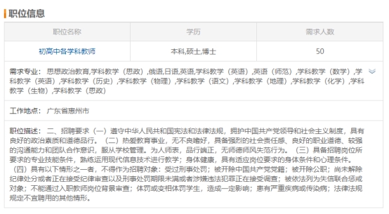 (四)具有以下情形之一者,不得作為招聘對(duì)象:受過刑事處罰;被開除中國(guó)共產(chǎn)黨黨籍;被開除公職;尚未解除紀(jì)律處分或者正在接受紀(jì)律審查以及刑事處罰期限未滿或者涉嫌違法犯罪正在接受調(diào)查;被依法列為失信聯(lián)合懲戒對(duì)象;不能通過入職教師崗位背景審查;體罰或變相體罰學(xué)生,造成一定影響;患有嚴(yán)重疾病或傳染病;法律法規(guī)規(guī)定不宜聘用的其他情形。