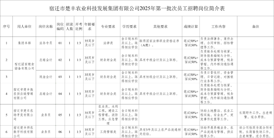 招聘單位和招聘崗位及相關(guān)要求等內(nèi)容,詳見附件《宿遷市楚豐農(nóng)業(yè)科技發(fā)展集團(tuán)有限公司2025年第一批次員工招聘崗位簡介表》(以下簡稱《崗位表》)。