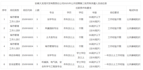因工作需要,蕪湖市人才發展集團受安徽大龍灣開發有限責任公司委托,面向社會開展勞務派遣人員公開招聘。現將有關事項公告如下: