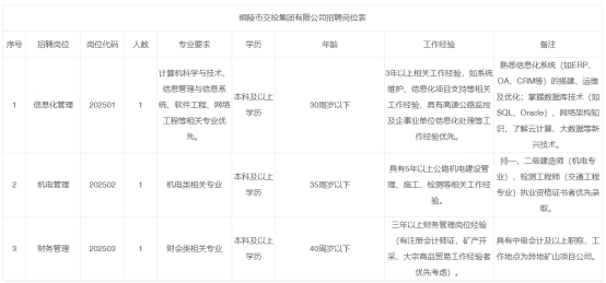 本次招聘為銅陵市交投集團所屬兩家子公司,其中:信息化管理崗、機電管理崗為同一家子公司,財務管理崗為另一家子公司。具體招聘崗位條件詳見附件《銅陵市交投集團招聘工作人員崗位表》。