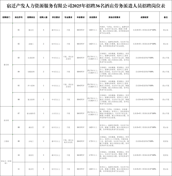 因工作需要,宿遷產(chǎn)發(fā)人力資源服務(wù)有限公司現(xiàn)面向社會(huì)公開(kāi)招聘36名酒店勞務(wù)派遣人員,派遣至宿遷某國(guó)有酒店工作,現(xiàn)將有關(guān)事項(xiàng)公布如下: