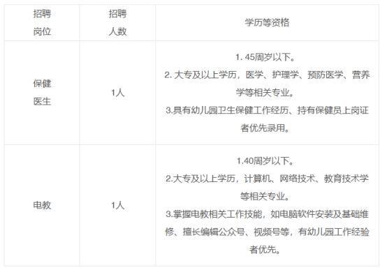 溫州市第五幼兒園為加強師資隊伍建設,經研究決定面向社會招聘保健醫生1名,電教1名,F就有關招聘事項公告如下: 一、基本條件 1.遵紀守法,熱愛學前教育事業,有良好的社會公德和職業道德; 2.有愛心,喜歡幼兒;身體心理健康,五官端正,無傳染性疾病和其他不宜從事幼兒教育的慢性疾病。 二、具體崗位和要求