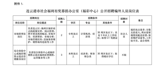 因工作需要,連云港市社會福利有獎募捐辦公室(福彩中心)決定面向社會公開招聘編外工作人員5名。具體公告如下: