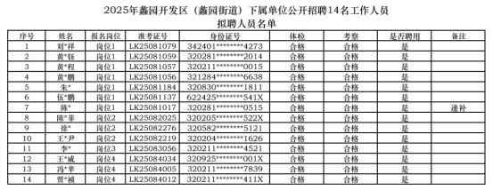 根據(jù)《2025年蠡園開發(fā)區(qū)(蠡園街道)下屬單位公開招聘14名工作人員招聘簡章》,經(jīng)過報(bào)名、資格初審、體測、筆試、面試、體檢及考察等工作,現(xiàn)對擬聘用人員進(jìn)行公示。公示期為5個(gè)工作日,自2025年9月26日至2025年10月9日。監(jiān)督電話:0510-85100516