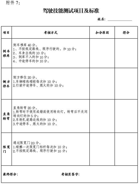 (四)駕駛技能測試(僅駕駛員參加)。共4個項目,分別為倒車入庫、側方停車、直角轉彎、限寬門,駕駛技能測試滿分100分,成績低于60分的不得進入下一環節。《駕駛技能測試項目及標準》(詳見附件7)。