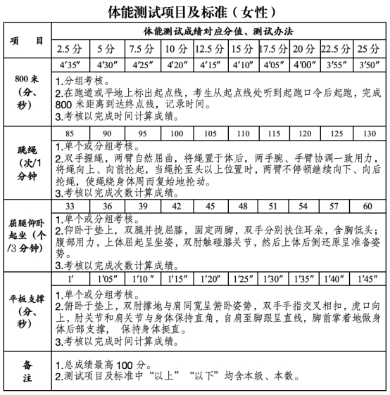 1、體能測試。男應聘者體能測試共4個項目,每個項目占25分,分別為1000米跑、立定跳遠、4*10米往返跑、俯臥撐。女應聘者體能測試共4個項目,每個項目占25分,分別為800米、跳繩、仰臥起坐、平板支撐。1000米和800米未取得2.5分以上(含本數)或體能測試總成績低于40分的不得進入下一環節。參加體能測試需攜帶本人有效期內的二代居民身份證、《報考人員承諾書》(詳見附件5)。