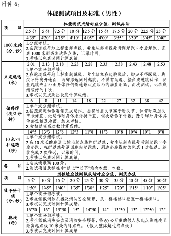 2、崗位適應性測試(僅專職隊員參加)。共2個項目,分別為徒手登10樓和拖拽,崗位適應性測試滿分100分,成績低于60分的不得進入下一環節。《體能測試、崗位適應性測試項目及標準》(詳見附件6)。