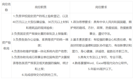 因工作需要,南京理工大學(xué)國有資產(chǎn)與實(shí)驗(yàn)室管理處現(xiàn)面向社會(huì)招聘1名勞務(wù)派遣人員從事資產(chǎn)驗(yàn)收工作,薪金待遇面議,具體招聘事宜如下: